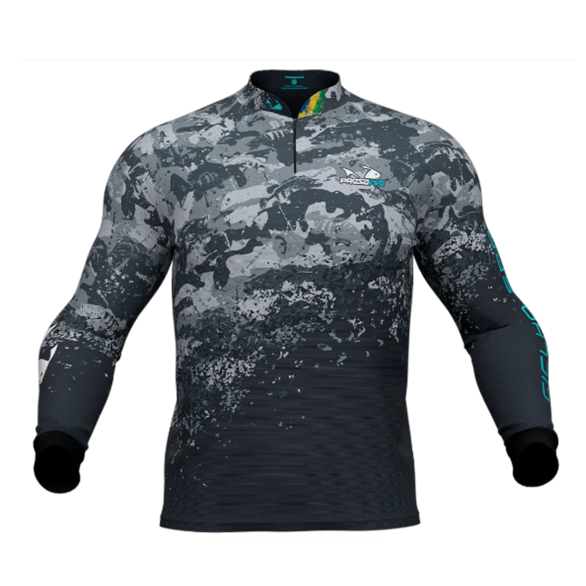 Camisa sublimada Presa Viva Tecnologia Dry, que proporciona máximo conformo térmico durante a atividade, modelo raglã manga longa, fechamento com zíper.