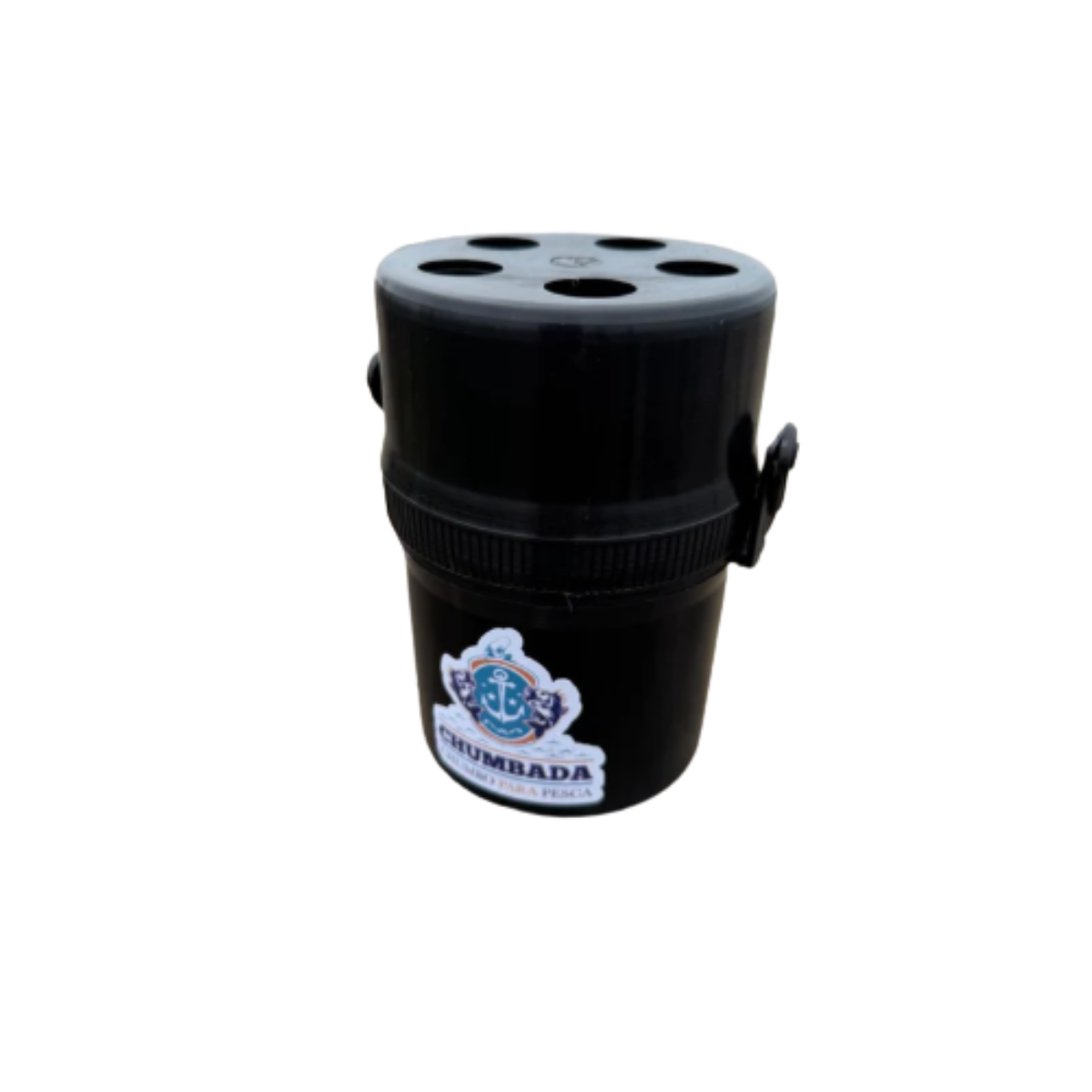 O Porta Isca e Chumbada é fabricado em plástico altamente resistente com rosca entre corpo e tampa assegurando que a mesma irá permanecer fechada, o mesmo possui alça de encaixe e desencaixe pois assim o pescador pode pendurar no carrinho de pesca, na cadeira ou na secretária de pesca.